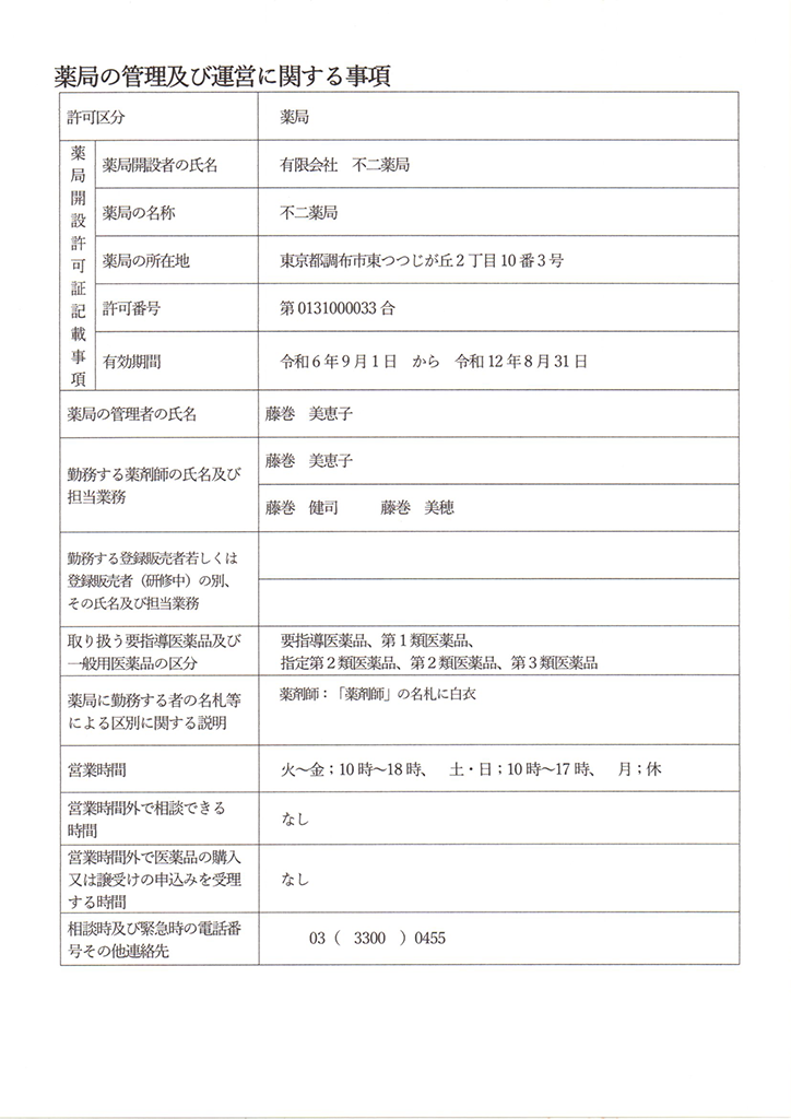 | 許可 | 開設許可番号 第0131000033号 薬局製剤製造業許可番号 (東局)第1031990035号 薬局製剤製造販売業許可番号 (東局)第1131990035号 |